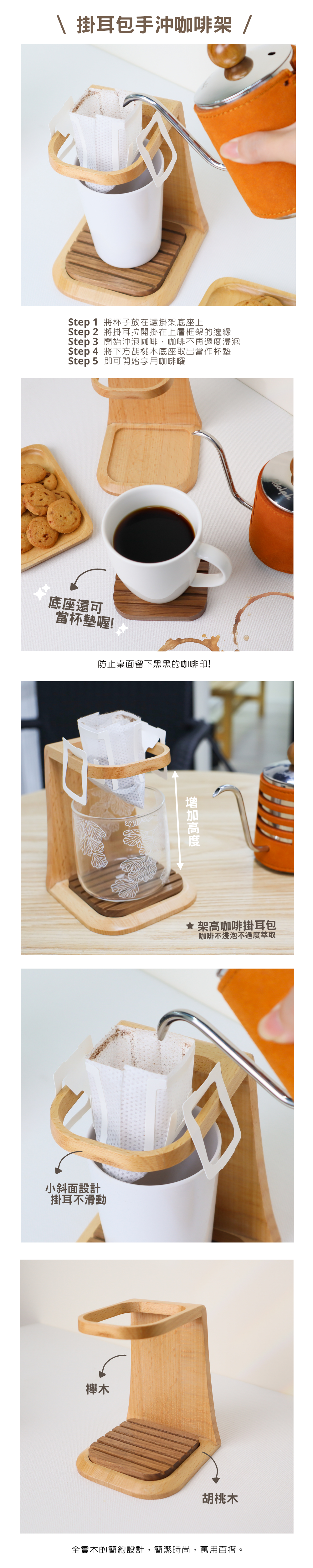 咖啡濾掛架♫ 櫸木濾掛架+胡桃木杯墊的二合一設計,功能性加倍。無銳角設計讓木材更加溫潤,而簡約的造型讓沖泡咖啡更有儀式感,咖啡與木材的結合使空間氛圍加倍療癒!